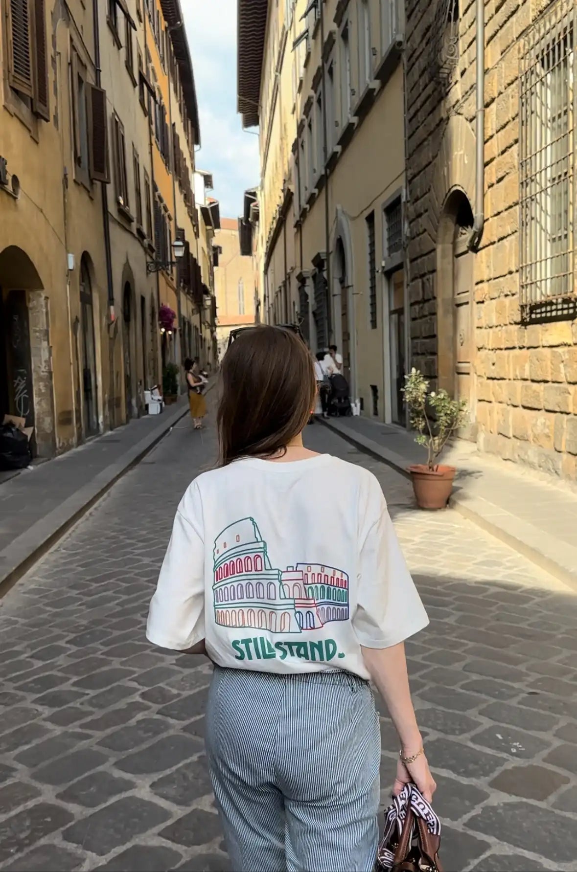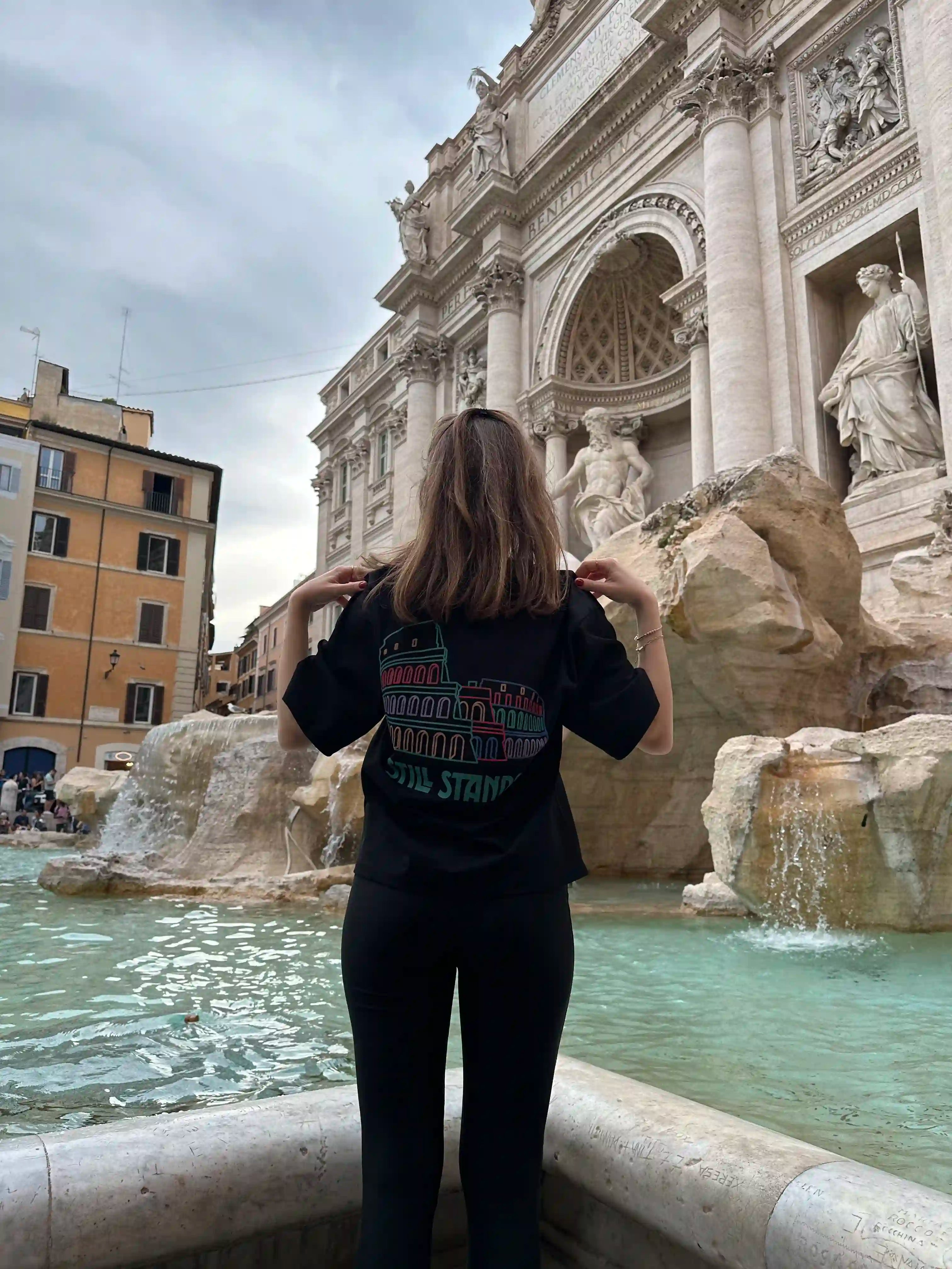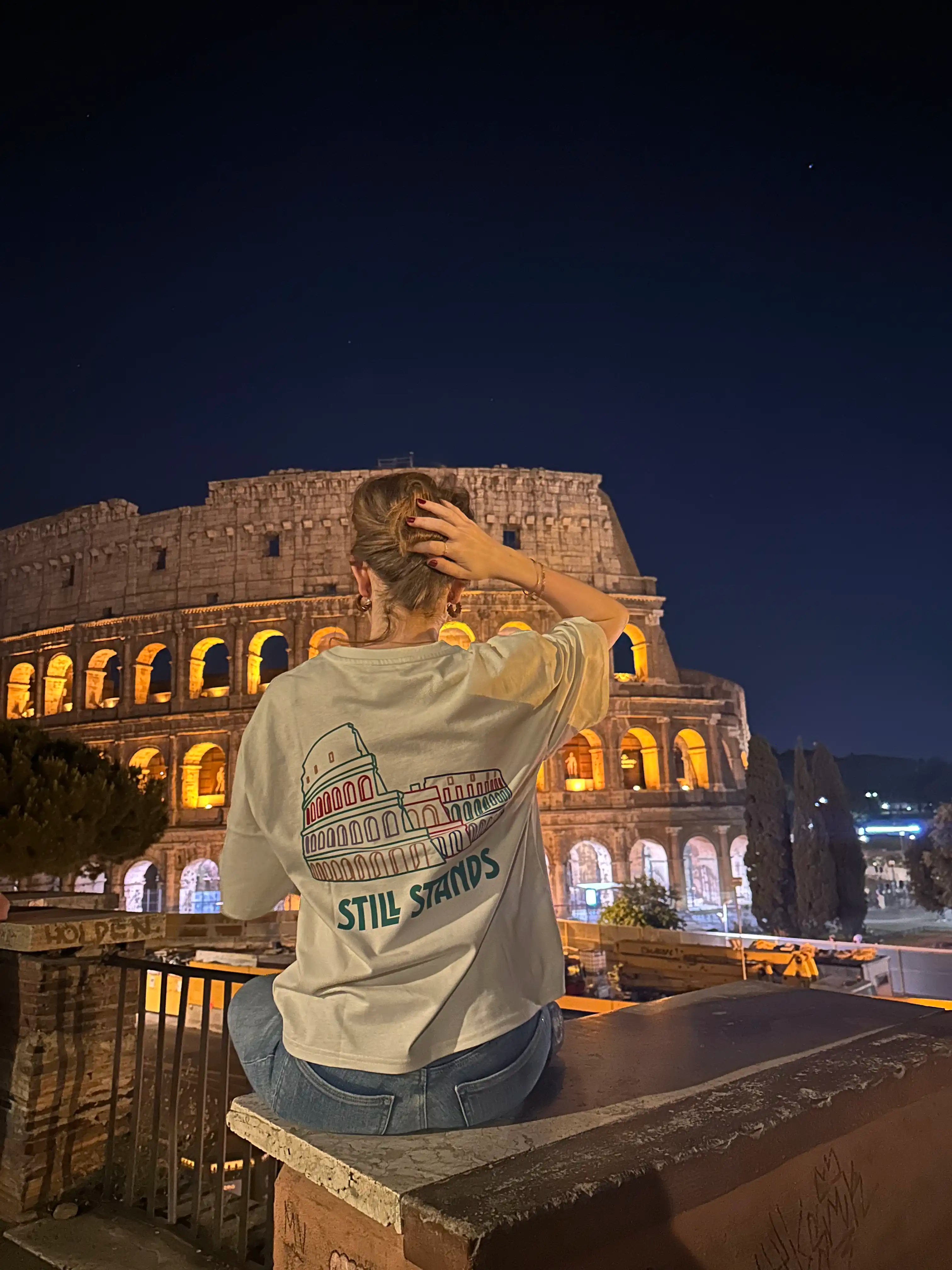 Kolezyum'un altında yer alan özgün yazıyla "Still Stands" ifadesi, hem geçmişin hem de bugünün ayakta kalma mücadelesini yansıtır. Zamana ve zorluklara meydan okuyanların hikayesini gururla taşır. Bu tişörtü giyen kişiler tıpkı Kolezyum gibi, zamanın ve hayatın zorluklarına karşı dimdik durmaktadır.