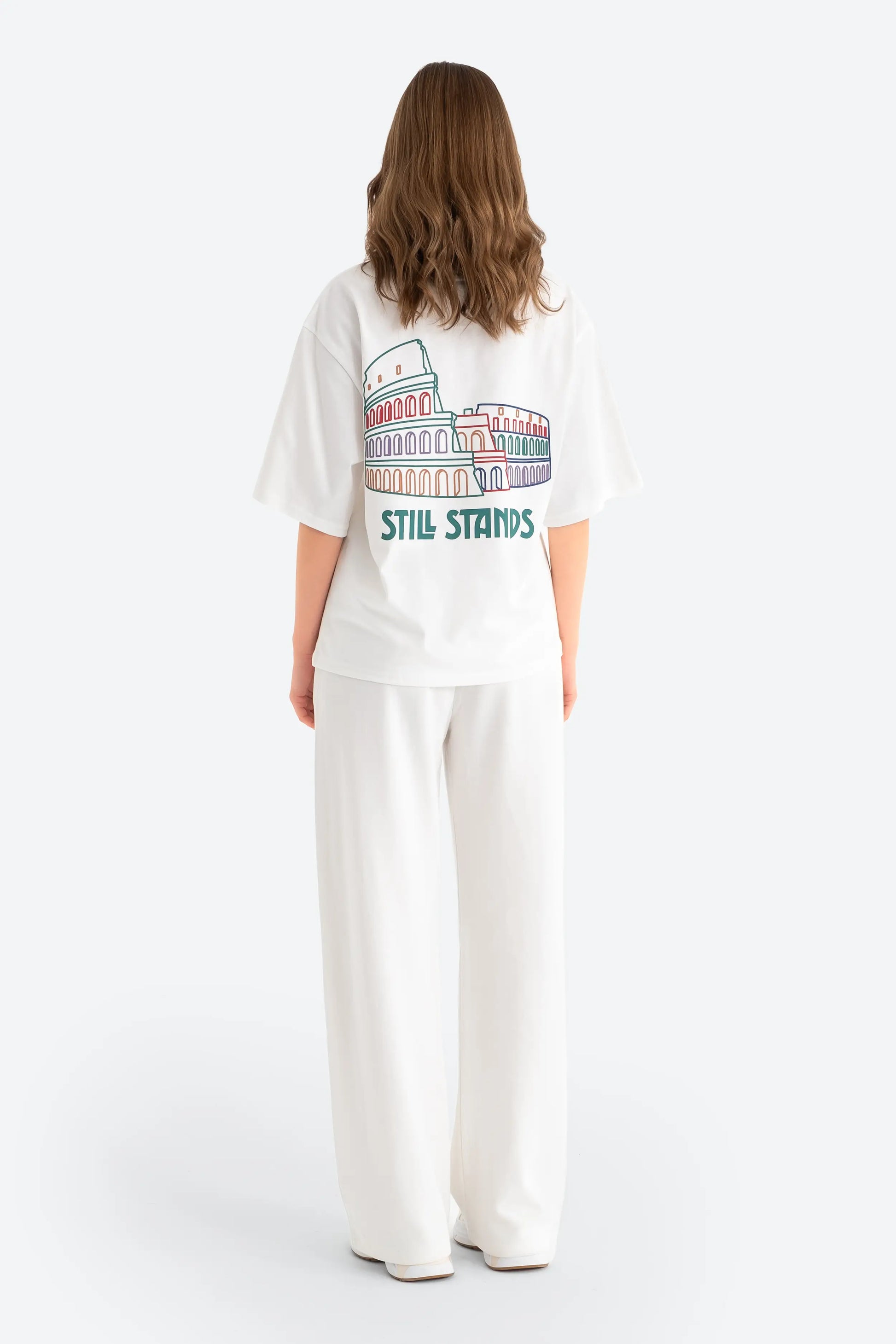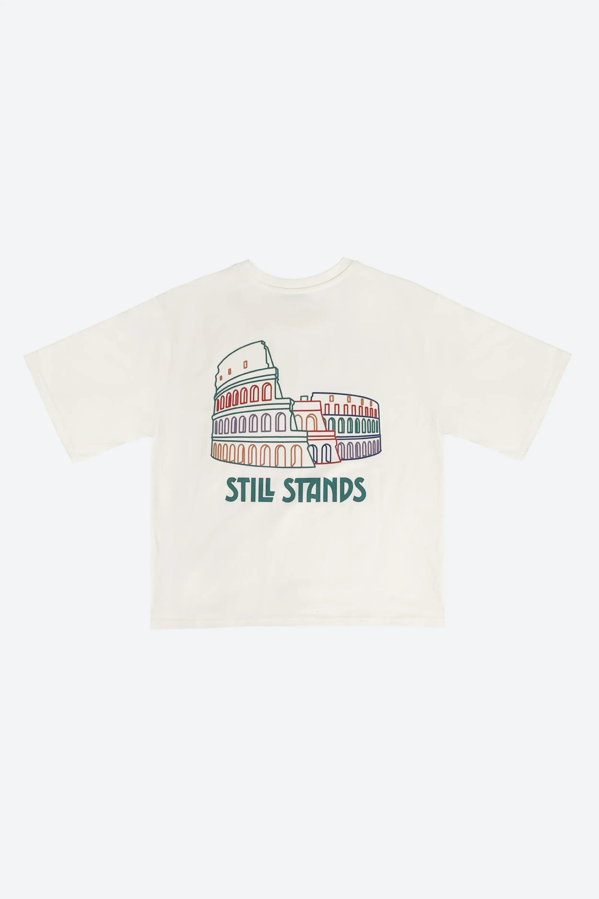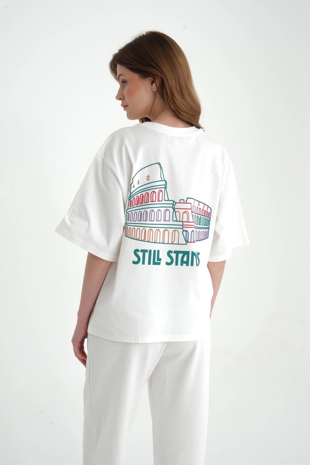 Kolezyum'un altında yer alan özgün yazıyla "Still Stands" ifadesi, hem geçmişin hem de bugünün ayakta kalma mücadelesini yansıtır. Zamana ve zorluklara meydan okuyanların hikayesini gururla taşır. Bu tişörtü giyen kişiler tıpkı Kolezyum gibi, zamanın ve hayatın zorluklarına karşı dimdik durmaktadır.
