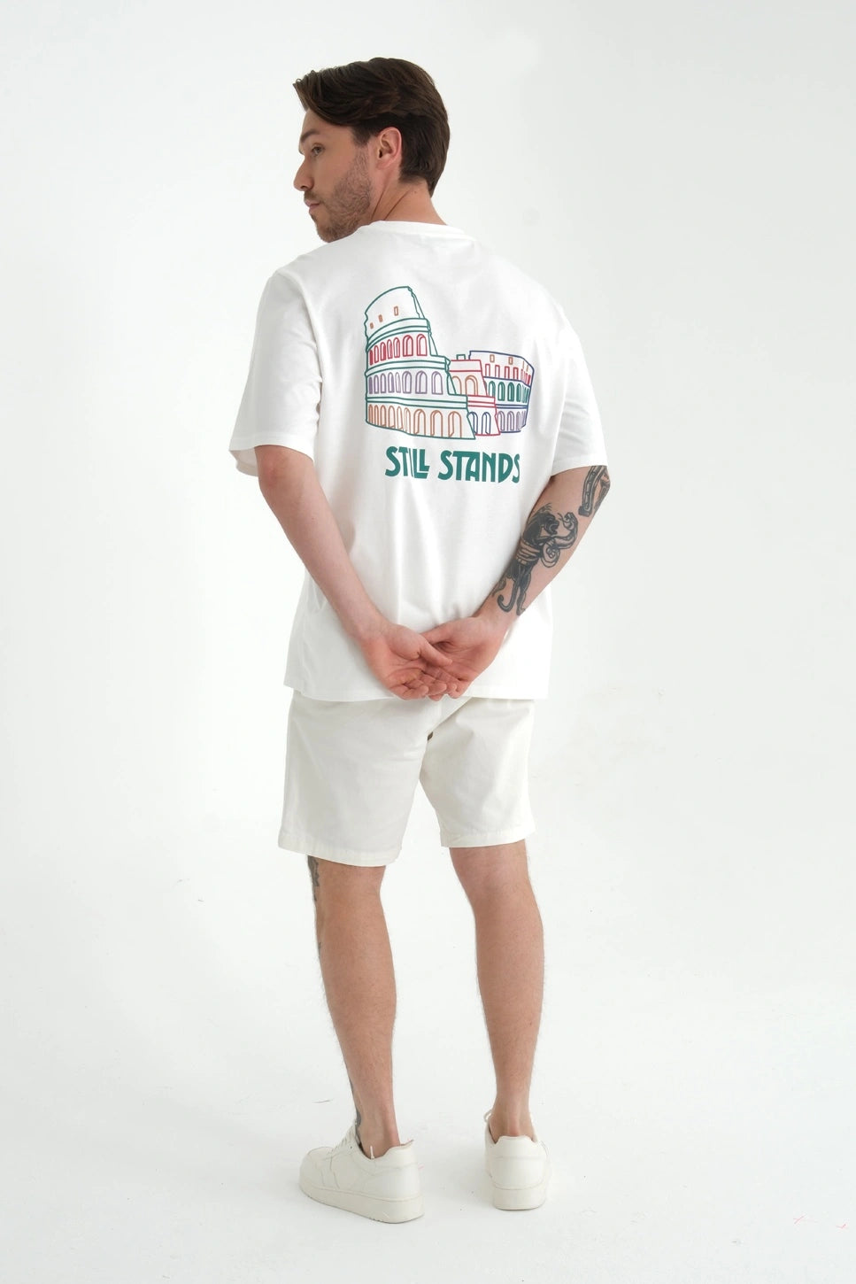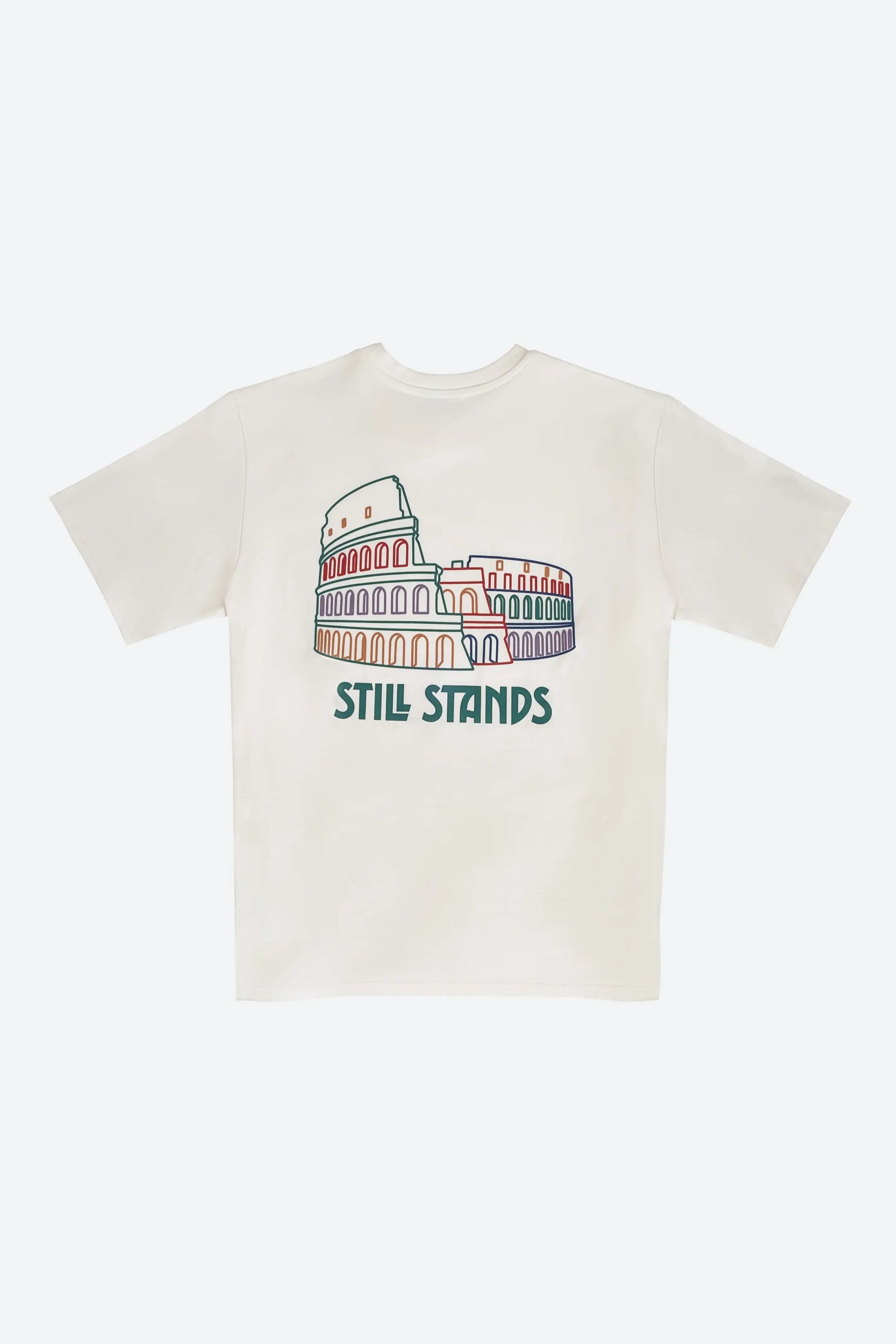 Kolezyum'un altında yer alan özgün yazıyla "Still Stands" ifadesi, hem geçmişin hem de bugünün ayakta kalma mücadelesini yansıtır. Zamana ve zorluklara meydan okuyanların hikayesini gururla taşır. Bu tişörtü giyen kişiler tıpkı Kolezyum gibi, zamanın ve hayatın zorluklarına karşı dimdik durmaktadır.