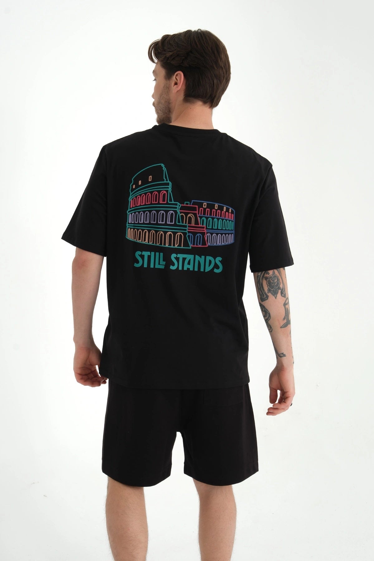 Kolezyum'un altında yer alan özgün yazıyla "Still Stands" ifadesi, hem geçmişin hem de bugünün ayakta kalma mücadelesini yansıtır. Zamana ve zorluklara meydan okuyanların hikayesini gururla taşır. Bu tişörtü giyen kişiler tıpkı Kolezyum gibi, zamanın ve hayatın zorluklarına karşı dimdik durmaktadır.