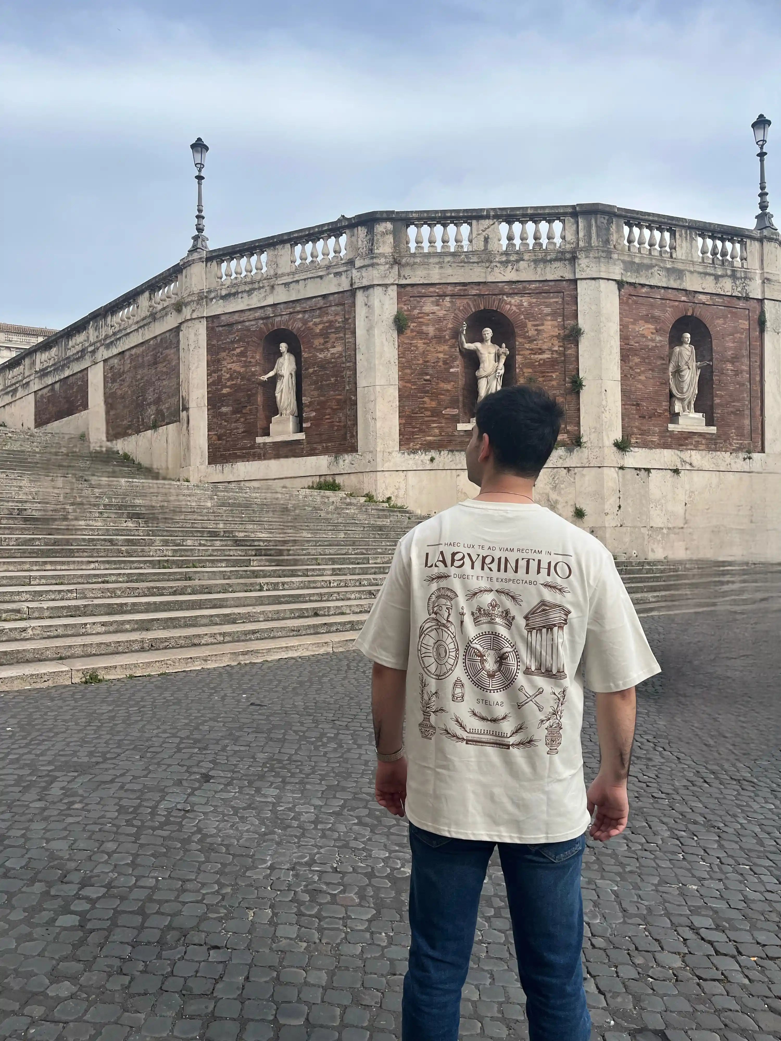 Stelias® Tasarım Ürünü: Tasarımcı imzalı arka yüzdeki büyüleyici Roma dönemi figürleri ve labirentlerin oluşturduğu kolaj, tarihin zenginliğini modern bir tarzla buluşturuyor.