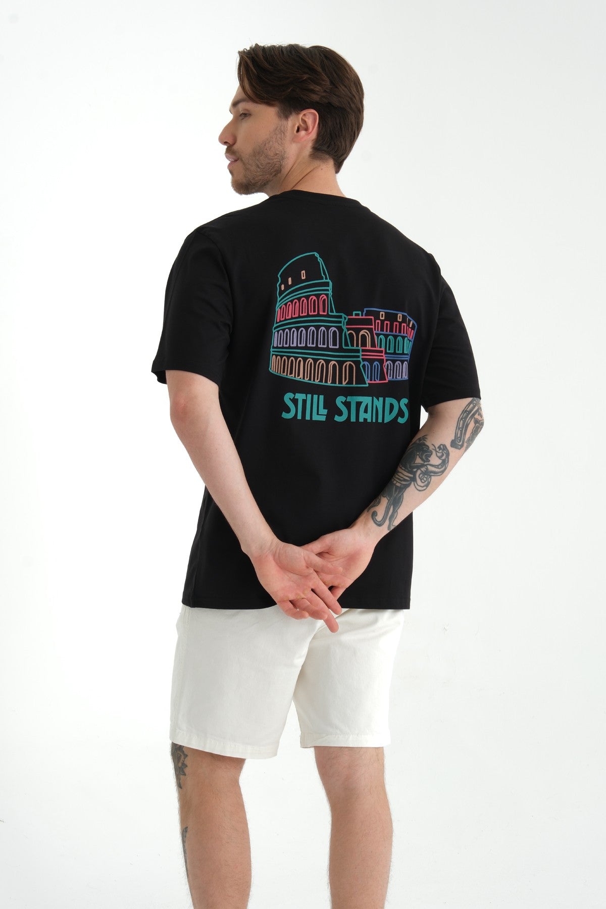 Kolezyum'un altında yer alan özgün yazıyla "Still Stands" ifadesi, hem geçmişin hem de bugünün ayakta kalma mücadelesini yansıtır. Zamana ve zorluklara meydan okuyanların hikayesini gururla taşır. Bu tişörtü giyen kişiler tıpkı Kolezyum gibi, zamanın ve hayatın zorluklarına karşı dimdik durmaktadır.